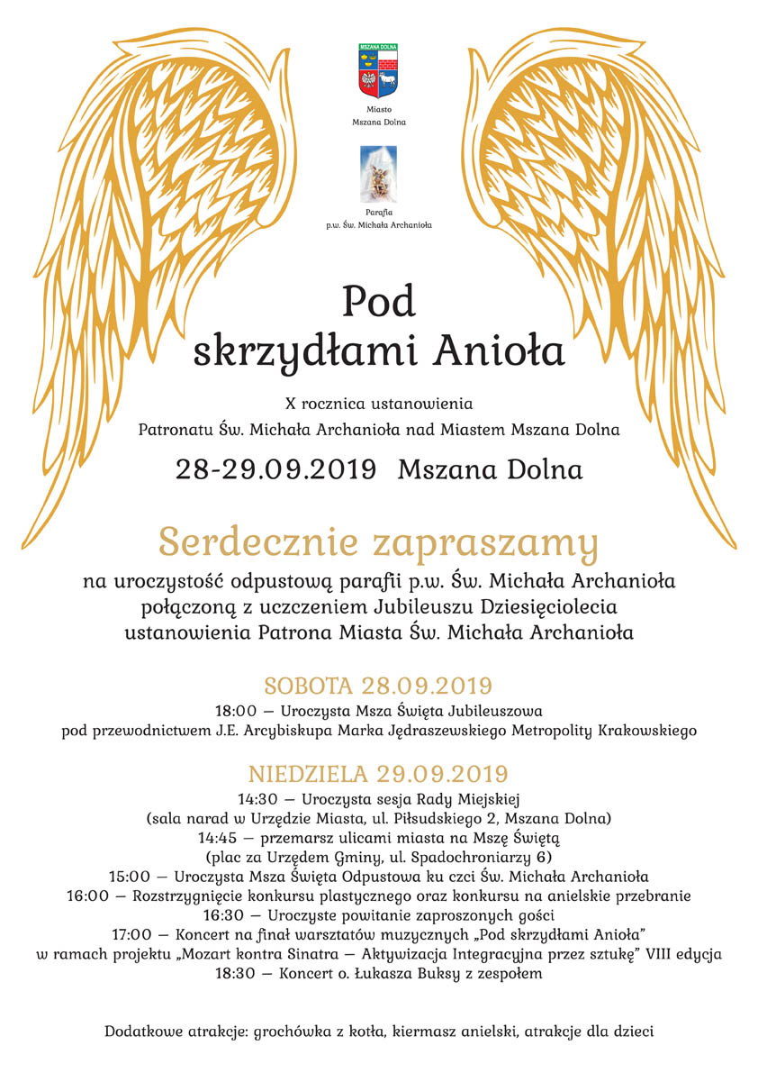 Rozpoczynamy przygotowanie do tegorocznych uroczystości odpustowych ku czci św. Michała Archanioła, które będą połączone z obchodami 10. rocznicy nadania patronatu św. Michała Archanioła naszemu miastu. W sobotę, 28 września na mszy św. o godz. 18:00, będziemy gościć ks. abp. Marka Jędraszewskiego, metropolitę krakowskiego. W niedzielę, 29 września w Urzędzie Miasta odbędzie się uroczysta Sesja Rady Miejskiej, po niej zaplanowany jest przemarsz orszaku aniołów na parking za Urzędem Gminy gdzie o godz. 15:00, zostanie odprawiona Msza Św. Odpustowa ku czci Św. Michała Archanioła, a po jej zakończeniu nastąpi rozstrzygnięcie konkursu plastycznego oraz konkursu na anielskie przebranie. O godz. 17:00 odbędzie się koncert finałowy warsztatów muzycznych zatytułowanych „Pod skrzydłami anioła - Mozart kontra Sinatra - Aktywizacja Integracyjna przez sztukę VIII edycja”. Na zakończenie, o godz. 18.30, rozpocznie się koncert o. Łukasza Buksy, rapującego franciszkanina, na który szczególnie zapraszamy młodzież.