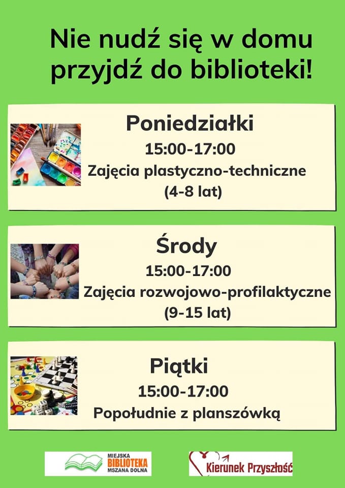 W poniedziałki, w godz. 15:00-17:00 odbywać się będą zajęcia plastyczno-techniczne dla dzieci z przedziału wiekowego od 4 do 8 lat, w środy zaplanowane są zajęcia rozwojowo-profilaktyczne dla dzieci od 9 do 15 lat, również w godz.15:00-17:00. Piątkowe popołudnia to świat planszówek, a jak wiadomo, świat gier planszowych kończy się na wiekowym limicie 100 lat….