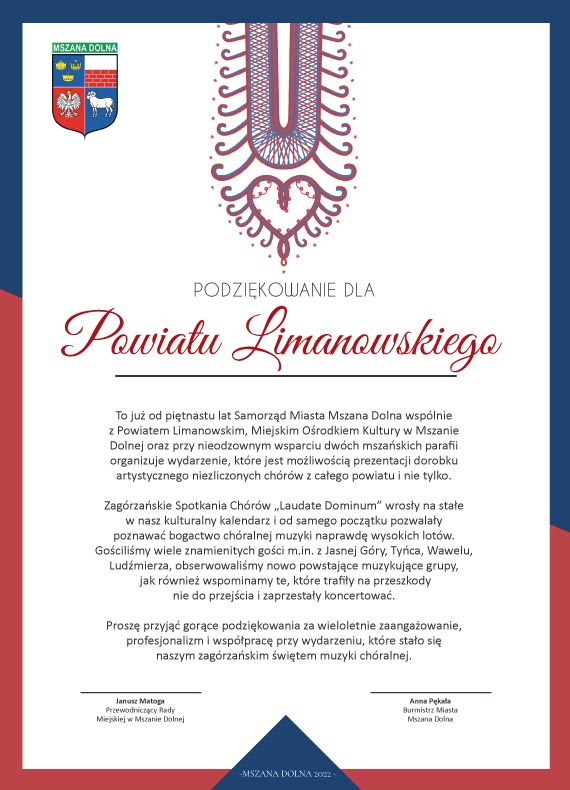 „To już od piętnastu lat Samorząd Miasta Mszana Dolna wspólnie z Powiatem Limanowskim, Miejskim Ośrodkiem Kultury w Mszanie Dolnej oraz przy nieodzownym wsparciu dwóch mszańskich parafii organizuje wydarzenie, które jest możliwością prezentacji dorobku artystycznego niezliczonych chórów z całego powiatu i nie tylko…” – tak brzmiały pierwsze słowa podziękowania przygotowanego na to jubileuszowe spotkanie.