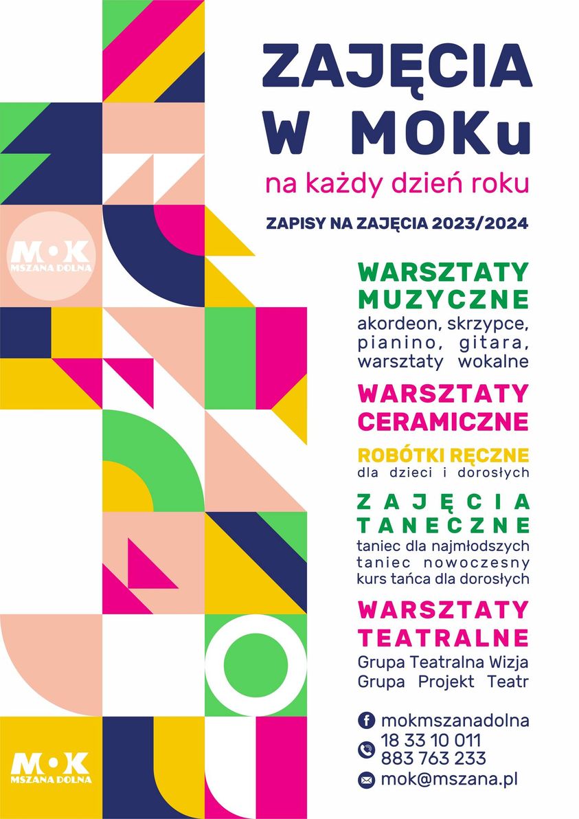 W Miejskim Ośrodku Kultury w Mszanie Dolnej trwają zapisy na zajęcia na nowy rok 2023/2024. Każdy kto chciałby spróbować swoich sił w muzyce, tańcu, artystycznych działaniach, twórczych grupach, spotkać innych o podobnej pasji, znaleźć inspirację czy odkryć swój ukryty talent na scenie – zapraszamy do MOK'u. Wszystkich chętnych - małych i dużych – zainteresowanych propozycjami naszej instytucji zachęcamy do zapisów.