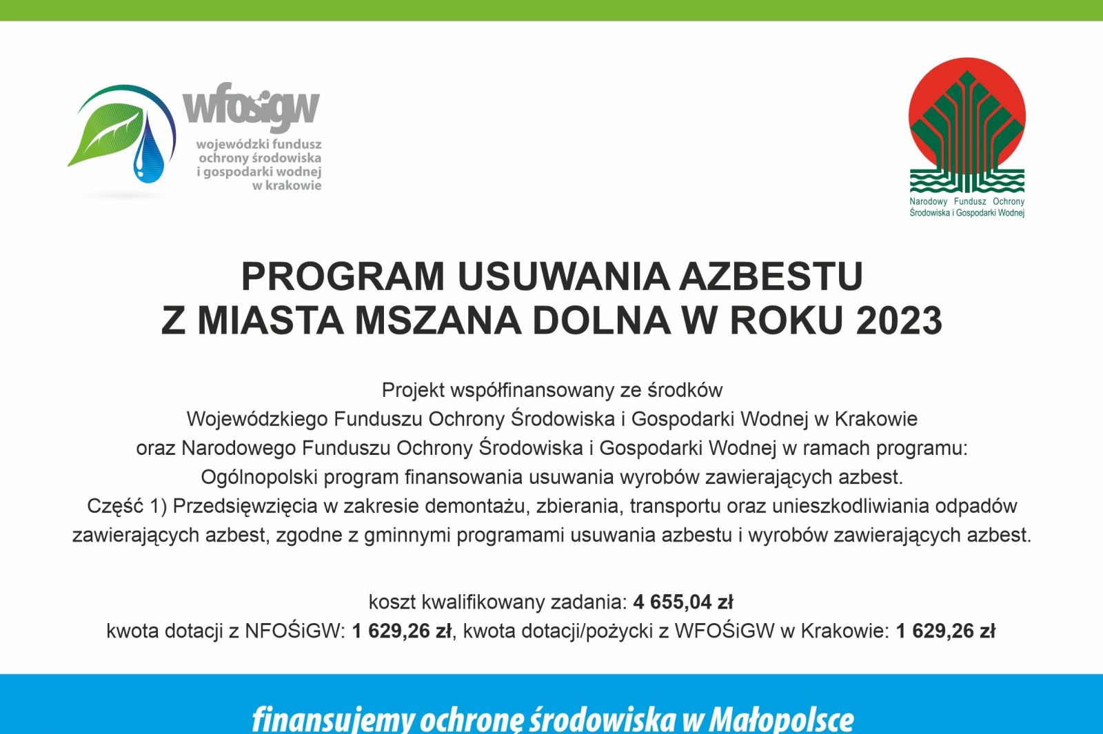 Szanowni Mieszkańcy, Pragniemy poinformować, ze w tym roku Miasto Mszana Dolna zrealizowało zadanie pt. Program usuwania azbestu z Miasta Mszana Dolna w roku 2023, zadanie było realizowanie w ramach Ogólnopolskiego programu finansowania usuwania wyrobów zawierających azbest, przy wsparciu Narodowego Funduszu Ochrony Środowiska i Gospodarki Wodnej oraz Wojewódzkiego Funduszu Ochrony Środowiska i Gospodarki Wodnej w Krakowie.
