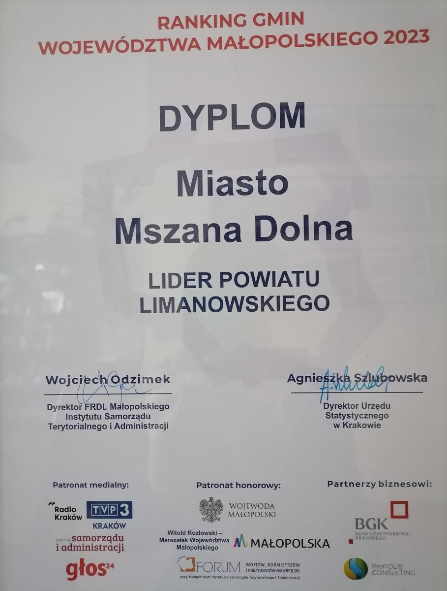 W piątek, 1 grudnia podczas uroczystej gali Forum Wójtów, Burmistrzów i Prezydentów Małopolski zaprezentowane zostały wyniki tegorocznej, 14. już edycji Rankingu Gmin Małopolski, który FRDL MISTiA od 2010 r. realizuje we współpracy z Urzędem Statystycznym w Krakowie. Poza wyróżnionymi trzema najlepszymi gmianami, które zdobyły kolejno: I miejsce - Gmina Wielka Wieś, II miejsce - Miasto i Gmina Niepołomice oraz III miejsce - Gmina Sękowa, wyróżniono gminy, które objęły prowadzenie w poszczególnych powiatach Małopolski. Liderem Powiatu Limanowskiego zostało Miasto Mszana Dolna. Dyplom i gratulacje od Łukasza Smółki - Wicemarszałka Województwa Małopolskiego, Dyrektor Urzędu Statystycznego - Agnieszki Szlubowskiej, Dyrektor Regionu Małopolskiego Banku Gospodarstwa Krajowego - Renaty Deptały i Dyrektora FRDL MISTiA - Wojciecha Odzimka odebrała Burmistrz Miasta Anna Pękała.