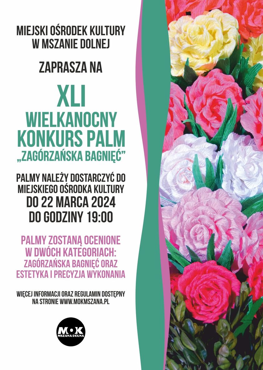 Miejski Ośrodek Kultury w Mszanie Dolnej zaprasza na 41 Konkurs Palm Wielkanocnych. Konkursowe palmy należy dostarczyć do MOKu do 22 marca (piątek) do godz. 19:00.