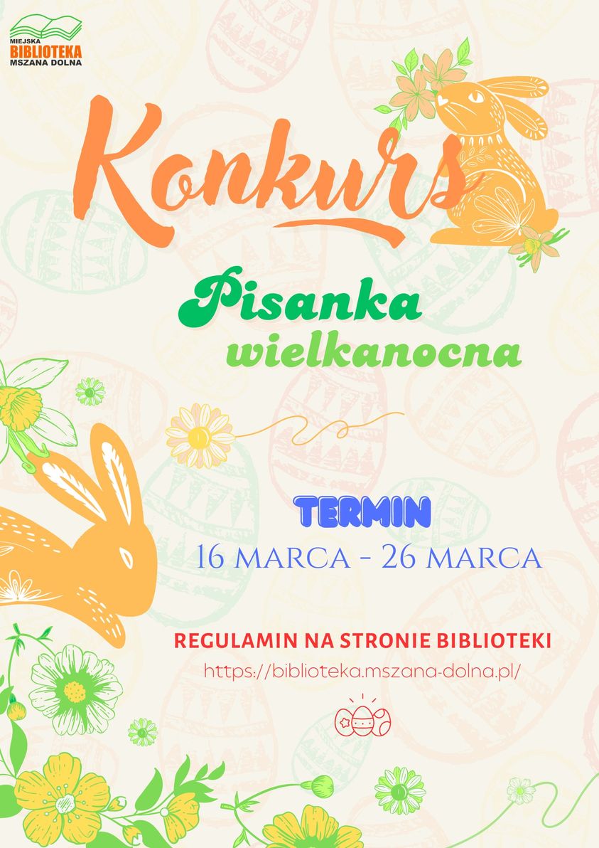 Konkurs przeznaczony jest dla przedszkolaków oraz uczniów szkół podstawowych z terenu miasta Mszana Dolna. Do 26 marca do Biblioteki Miejskiej można dostarczać opisane prace. Tym razem ozdoba wielkanocna może być wykonana tylko przez jednego ucznia. Prace grupowe nie będą przyjmowane. Specjalna komisja powołana przez organizatorów dokona oceny prac oraz przyzna nagrody i wyróżnienia.