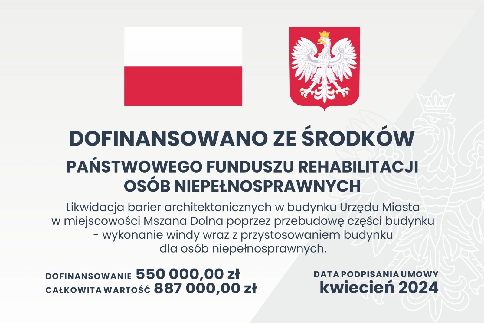 Inwestycja pn. „Likwidacja barier architektonicznych w budynku Urzędu Miasta w miejscowości Mszana Dolna poprzez przebudowę części budynku - wykonanie windy wraz z przystosowaniem budynku dla osób niepełnosprawnych” realizowana jest w ramach programu „Dostępna przestrzeń publiczna” ze środków PFRON. Zadanie otrzymało dofinansowanie w kwocie 550 000,00 zł.