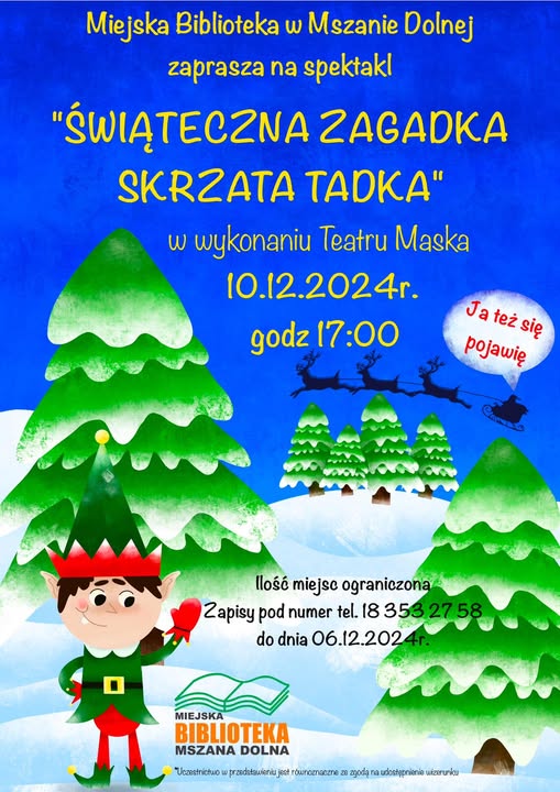 Miejska Biblioteka zaprasza w wtorek, 10 grudnia o godz. 17:00 na spektakl „Świąteczna zagadka skrzata Tadka” wykonaniu teatru „Maska”. Zaplanowana jest również wizyta Świętego Mikołaja i wręczanie prezentów. Na to wyjątkowe wydarzenie przyjmowane są zapisy, gdyż liczba miejsc jest ograniczona.