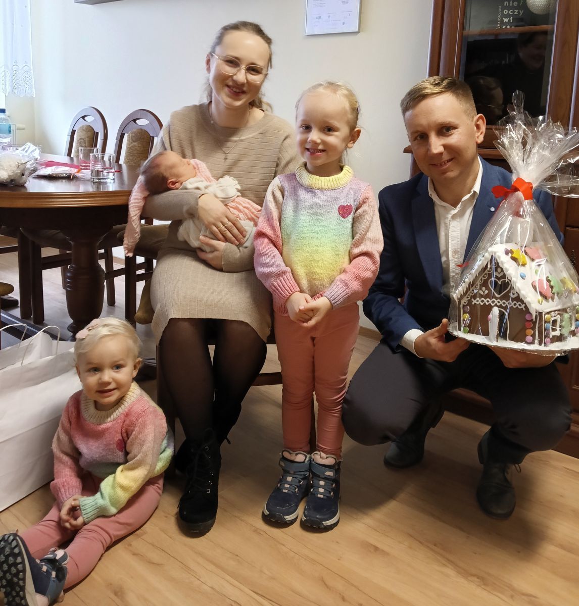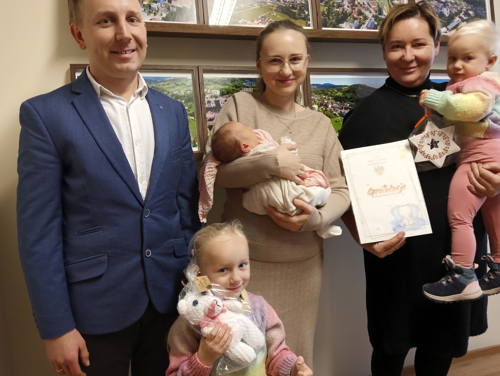 Poznajcie małą Anielkę – to urocza dziewczynka, która urodziła się w Mszanie Dolnej – tak będzie miała już wpisane w swoim akcie urodzenia. Takie wpisy możliwe były jeszcze w latach 70-tych, kiedy w naszym mieście znajdowała się izba porodowa. Kolejne pokolenia przychodziły już na świat w okolicznych szpitalach. Stąd też zdajemy sobie sprawę, że jest to wydarzenie, które należało odpowiednio uczcić, cała rodzinka w komplecie: dumni rodzice razem ze starszymi córeczkami Kornelią i Blanką odwiedzili w piątek urząd miasta, by przyjąć osobiście gratulacje od Burmistrz Agnieszki Orzeł i Kierownik USC Faustyny Kaletki.