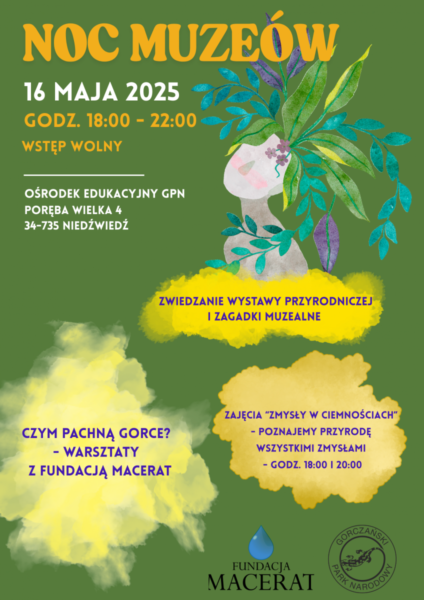 W ten wyjątkowy wieczór będzie można zwiedzić wystawę przyrodniczą i uczestniczyć w warsztatach „Czym pachną Gorce” przygotowanych przez Fundację Macerat.