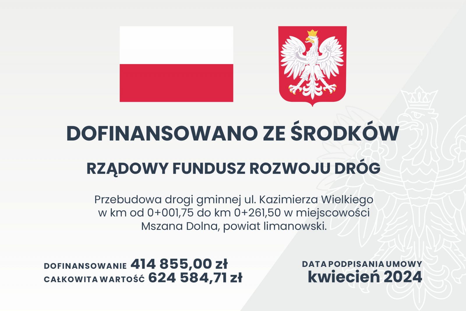 Inwestycja pn. „Przebudowa drogi gminnej ul. Kazimierza Wielkiego w km od 0+001,75 do km 0+261,50 w miejscowości Mszana Dolna, powiat limanowski” realizowana jest w ramach Rządowego Funduszu Rozwoju Dróg. Zadanie otrzymało dofinansowanie w kwocie 414 855,00 zł. Rządowy Fundusz Rozwoju Dróg stanowi kompleksowy instrument wsparcia realizacji zadań na drogach zarządzanych przez jednostki samorządu terytorialnego.