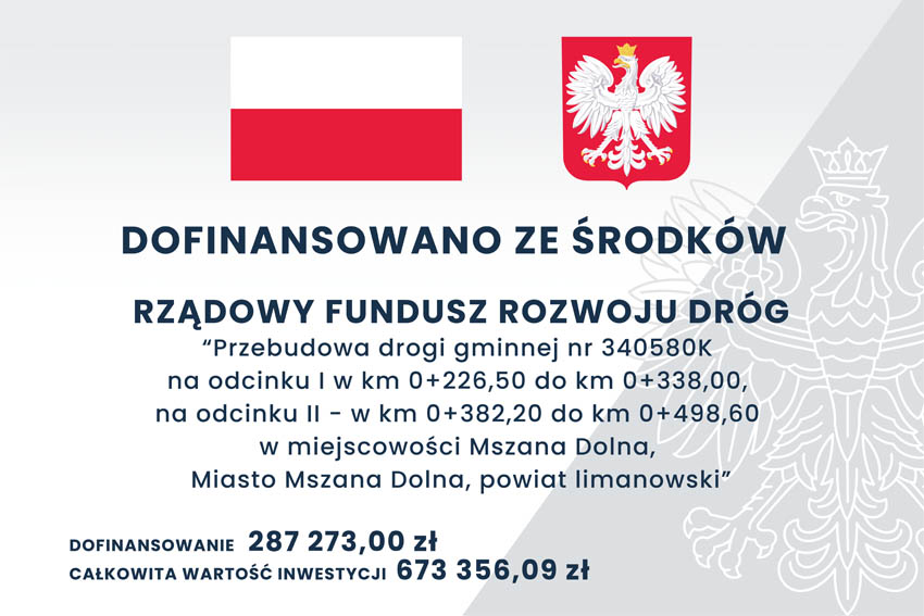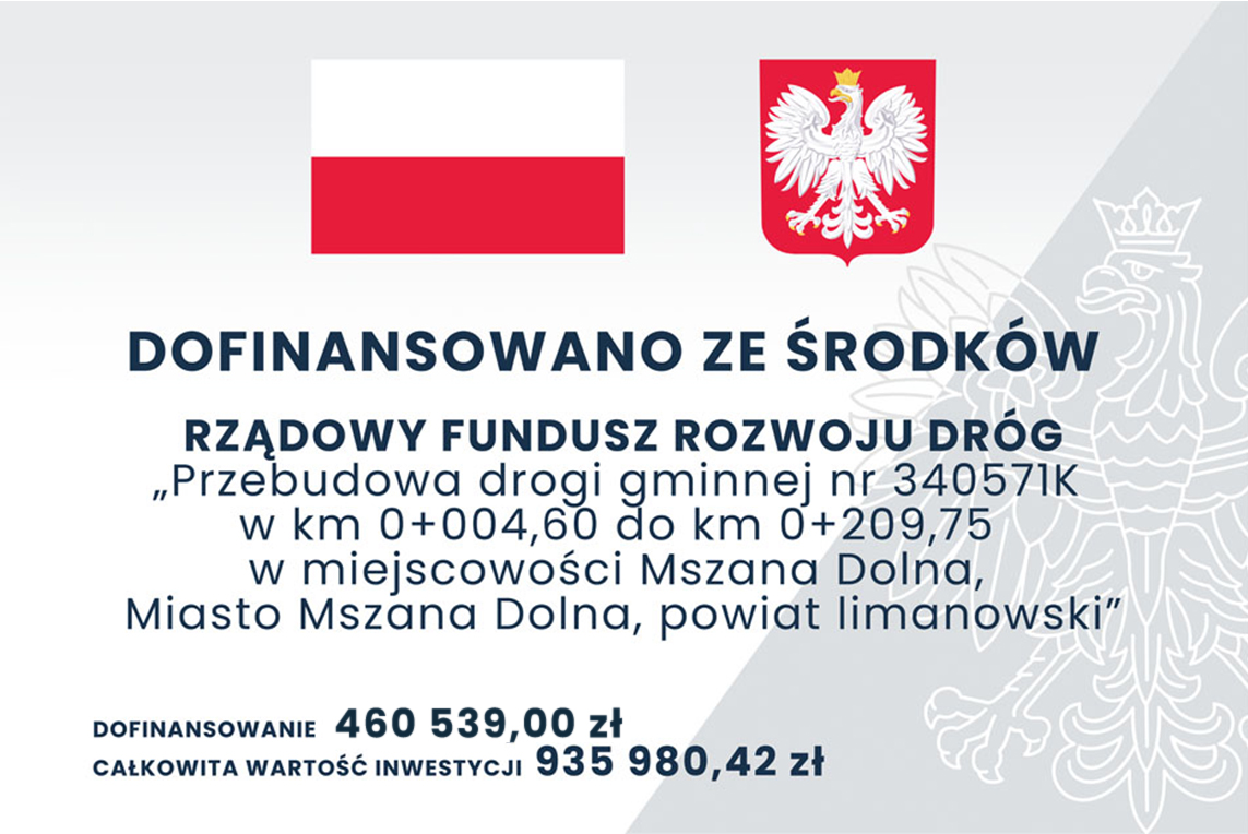 Inwestycja pn. „Przebudowa drogi gminnej nr 340580K na odcinku I w km 0+226,50 do km 0+338,00, na odcinku II - w km 0+382,20 do km 0+498,60 w miejscowości Mszana Dolna, Miasto Mszana Dolna, powiat limanowski.” realizowana jest w ramach Rządowego Funduszu Rozwoju Dróg. Zadanie otrzymało dofinansowanie w kwocie 287 273,00 zł. Rządowy Fundusz Rozwoju Dróg stanowi kompleksowy instrument wsparcia realizacji zadań na drogach zarządzanych przez jednostki samorządu terytorialnego.