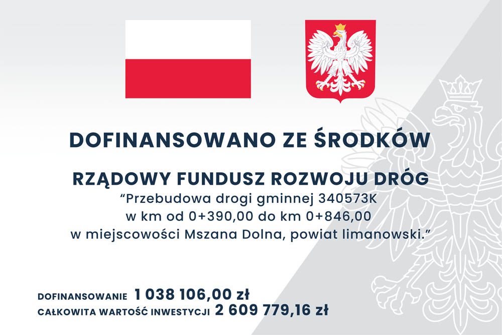 Inwestycja pn. „Przebudowa drogi gminnej 340573K w km od 0+390,00 do km 0+846,00 w miejscowości Mszana Dolna, powiat limanowski” realizowana jest w ramach Rządowego Funduszu Rozwoju Dróg. Zadanie otrzymało dofinansowanie w kwocie 1 038 106,00 zł. Rządowy Fundusz Rozwoju Dróg stanowi kompleksowy instrument wsparcia realizacji zadań na drogach zarządzanych przez jednostki samorządu terytorialnego.