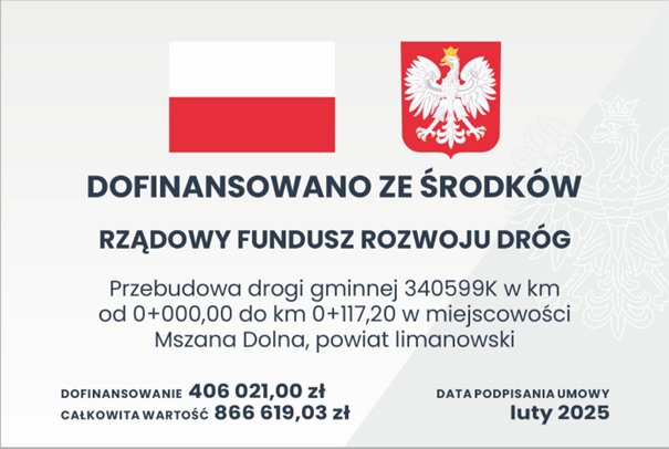 Inwestycja pn. „Przebudowa drogi gminnej 340599K w km od 0+000,00 do km 0+117,20 w miejscowości Mszana Dolna, powiat limanowski” realizowana jest w ramach Rządowego Funduszu Rozwoju Dróg. Zadanie otrzymało dofinansowanie w kwocie 406 021,00 zł. Rządowy Fundusz Rozwoju Dróg (RFRD) stanowi kompleksowy instrument wsparcia realizacji zadań na drogach zarządzanych przez jednostki samorządu terytorialnego.