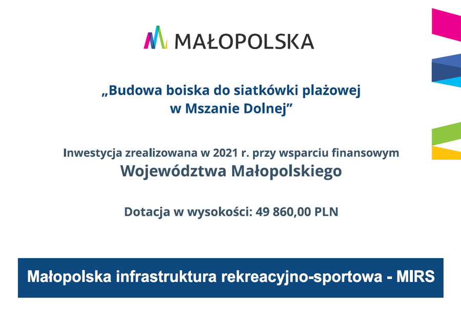 Inwestycja pn. „Budowa boiska do siatkówki plażowej w Mszanie Dolnej” realizowana jest w ramach projektu pn. „Małopolska infrastruktura rekreacyjno-sportowa – MIRS”. Zadanie otrzymało pomoc finansową z budżetu Województwa Małopolskiego w formie dotacji celowej w wysokości 49 860,00 zł.