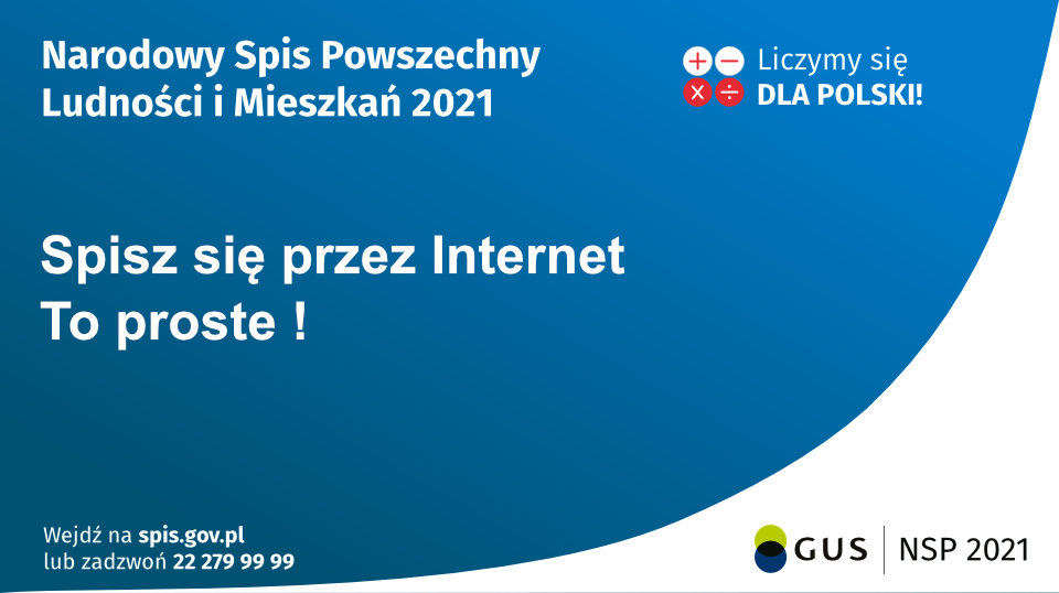 W związku z rozpoczęciem Narodowego Spisu Powszechnego Ludności i Mieszkań 2021 i jego wydłużeniem do 30 września br. uprzejmie informujemy, że podstawową metodą realizacji obowiązku spisowego jest samospis poprzez aplikację: kliknij tutaj