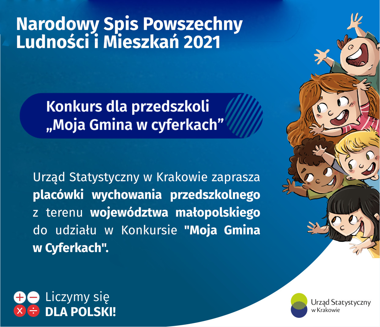 W ramach promocji Narodowego Spisu Powszechnego Ludności i Mieszkań 2021 Urząd Statystyczny w Krakowie organizuje konkurs „Moja Gmina w cyferkach”, którego adresatami są placówki wychowania przedszkolnego z województwa małopolskiego.